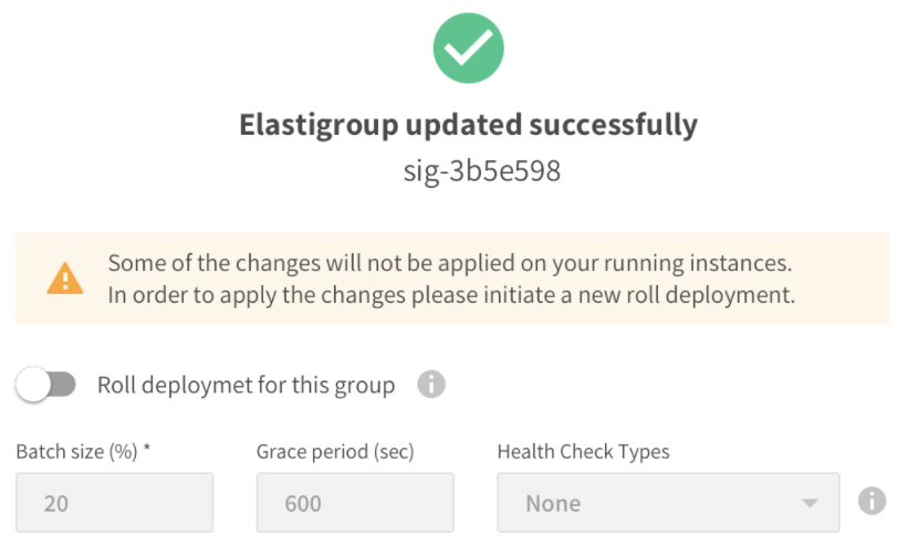 • Made changes to the Elastigroup that affect the VM configuration. In this case, you will be prompted automatically to create a new deployment after updating the configuration.