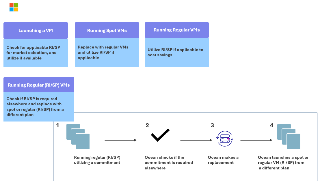 As part of the revert to commitments process, Ocean replaces spot VMs with regular VMs and utilizes RI/SP if applicable.